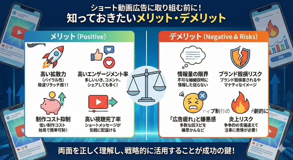 ショート動画広告は非常に強力なツールですが、導入を検討する上では、その輝かしいメリットだけでなく、注意すべきデメリットやリスクも理解しておくことが重要です。