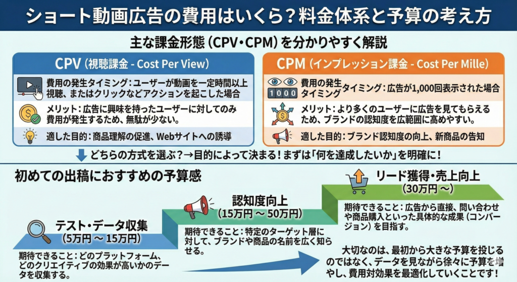 ここでは、ショート動画広告にかかる費用の仕組みと、初めて出稿する際の予算の考え方について、専門用語を避けながら分かりやすく解説します。