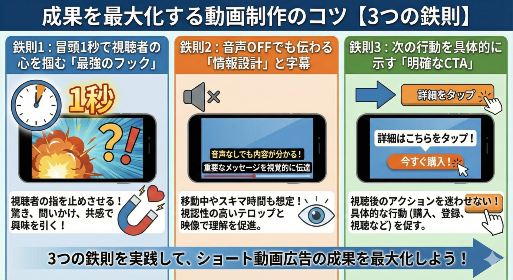 効果的なショート動画広告を制作するには、いくつかの重要な「鉄則」があります。