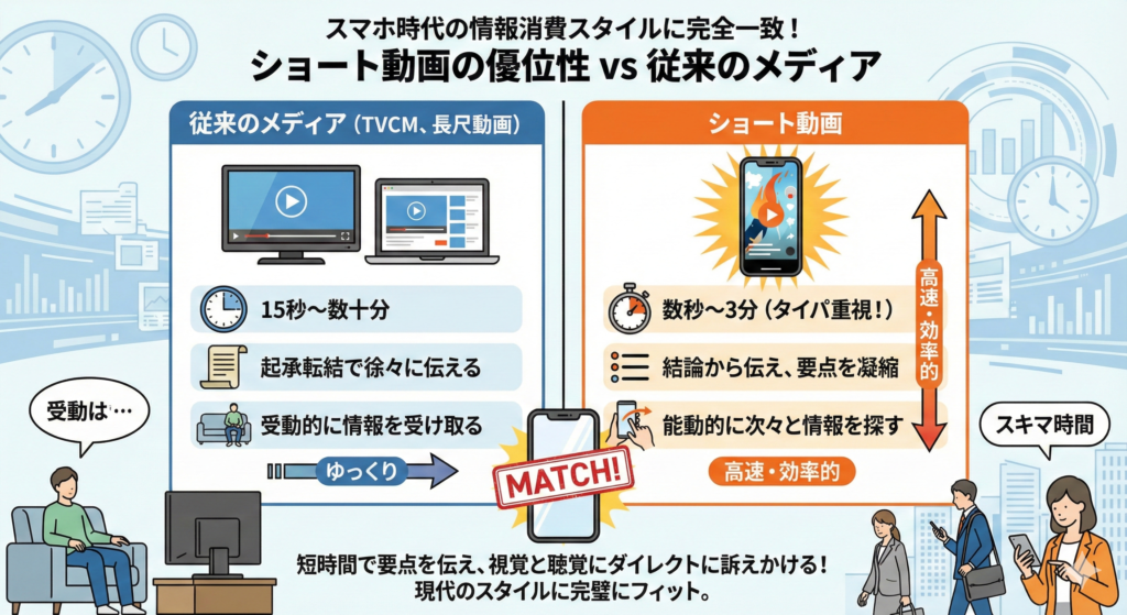 ショート動画は、まさにこの現代の情報消費スタイルに完璧に合致したフォーマットです。