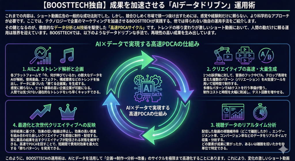 このように、BOOSTTECHの運用術は、AIとデータを活用して「企画→制作→分析→改善」のサイクルを極限まで高速化することにあります。これにより、変化の激しいショート動画市場においても、常に最適な広告配信を実現し、ビジネスの成長を力強く後押しします。