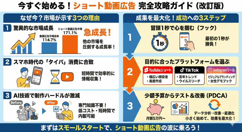 この記事を読めば、あなたは自信を持ってショート動画広告の第一歩を踏み出し、自社のビジネス成長を加速させることができるでしょう。