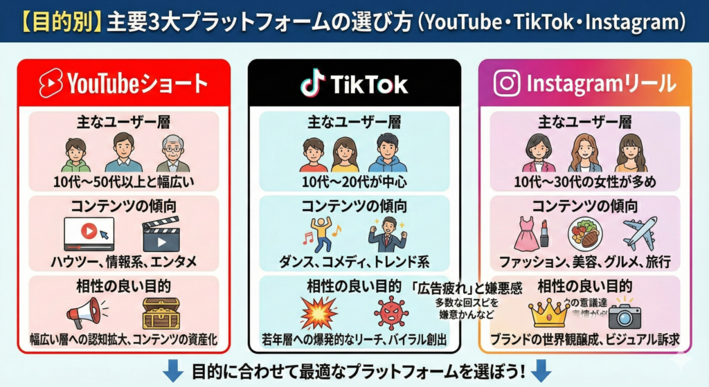【目的別】主要3大プラットフォームの選び方(YouTube・TikTok・Instagram)