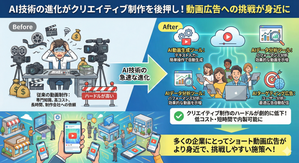 AI技術をうまく活用することで、クリエイティブ制作のハードルは劇的に下がっています。これにより、多くの企業にとってショート動画広告がより身近で、挑戦しやすい施策となっているのです。