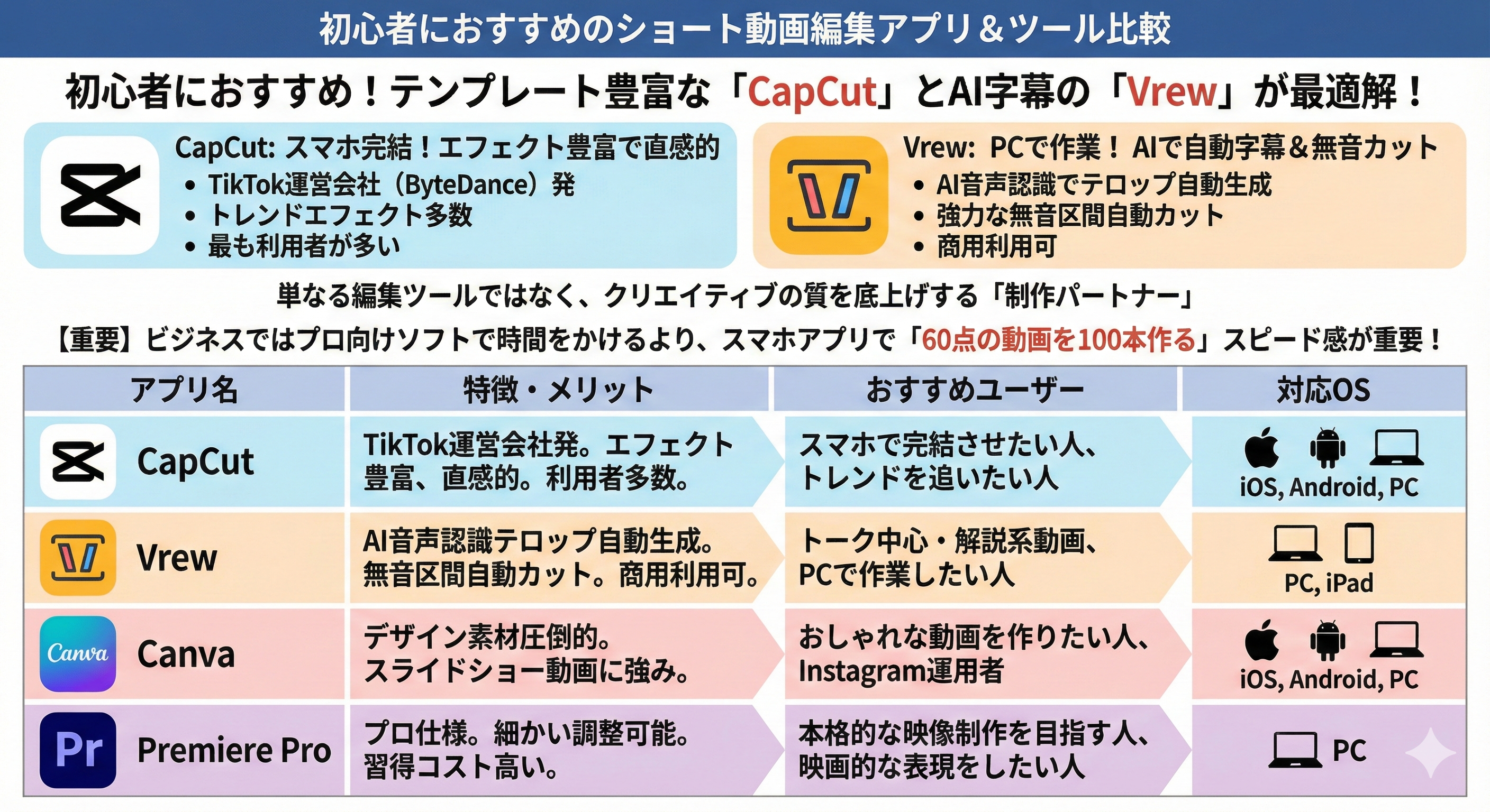 - 必須アプリ: 直感操作のCapCut(万能型)、AIテロップ生成のVrew(効率重視)、デザイン性のCanva。