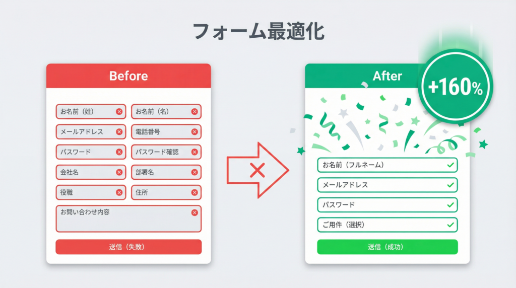 フォームは最後の関門であり、最大の離脱ポイントでもある。フォームに入力を始めた人の81%が途中で離脱する(Cobloom)。しかしフィールド数を11個から4個に減らすと離脱率は劇的に改善し、CVRが160%向上した事例が記録されている。5フィールドのフォームは120%のコンバージョンブーストをもたらすとも報告されている。