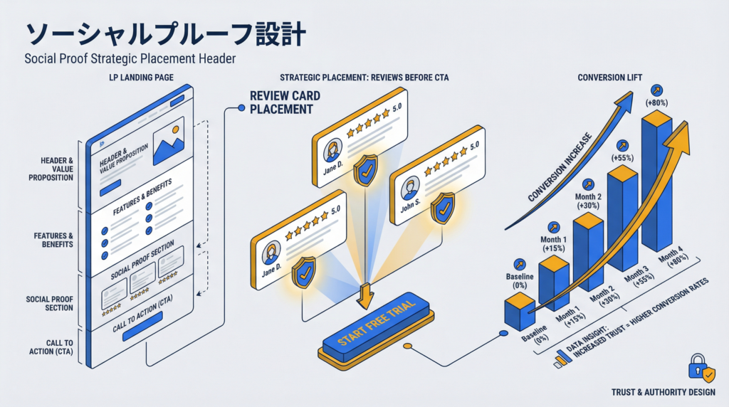 2026年に特徴的なのは「数字付きのソーシャルプルーフ」の優位性だ。「満足しています」より「導入3ヶ月でリード数が2.8倍になりました(山田太郎・株式会社〇〇 マーケティング部長)」のほうが具体性と信頼性が格段に高い。企業名・役職・数字の三点セットが、2026年の標準フォーマットになっている。